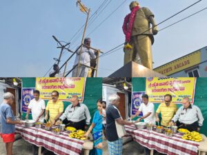 మాజీ మంత్రివర్యులు లయన్స్ క్లబ్ ఆఫ్ ఇంటర్నేషనల్ మాజీ గవర్నర్ స్వర్గీయ కోనేరు నాగేశ్వరావు గారి 9 వ వర్ధంతి సందర్భంగా జిల్లా కేంద్రంలోని రైల్వే అండర్ బ్రిడ్జి సమీపంలో గల కోనేరు కాంస్య విగ్రహానికి పూలమాల వేసి ఘనంగా నివాళులర్పించిన కొత్తగూడెం క్లబ్ కార్యదర్శి సీనియర్ లయన్ కోనేరు పూర్ణచందర్రావు.ఈ సందర్భంగా జరిగిన కార్యక్రమంలో ఆయన మాట్లాడుతూ నాన్నగారి స్ఫూర్తితో లయన్స్ క్లబ్,కోనేరు ట్రస్ట్ ద్వారా మున్ముందు మరిన్ని సేవ కార్యక్రమాలు చేపడతానని తెలియజేశారు. అనంతరం జ్యోతి అనాధ వృద్ధాశ్రమంలో వృద్ధులకు దివ్యాంగులకు అన్నదాన కార్యక్రమం నిర్వహించారు.ఈ కార్యక్రమంలో లయన్స్ క్లబ్ ఆఫ్ కొత్తగూడెం అధ్యక్షులు లగడపాటి రమేష్ చంద్, మాజీ అధ్యక్షులు దస్తగిరి, మొరిశెట్టి మోహన్ రావు తదితరులు పాల్గొన్నారు.
